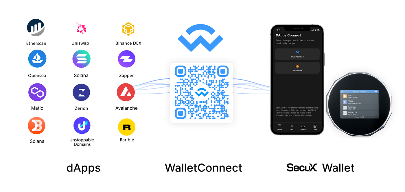 WalletConnect is a protocol which facilitates a communication between dApps and wallet through a secure connection. WalletConnect allows crypto wallets to connect with desktop dApps simply by scanning a QR code to establish a secure connection and send over end-to-end encrypted messages, allowing users to sign these messages without private key leaving their mobile wallets.